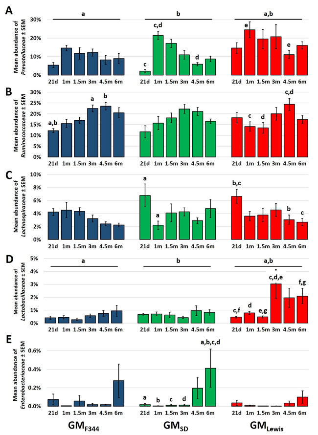 Figure 5: The Lewis GM undergoes a progression distinct from that of F344 or SD. Bar charts demonstrating the progression in terms of relative abundance (mean ± SEM) of Prevotellaceae A., Ruminococcaceae B., Lachnospiraceae C., Lactobacillaceae D., and Enterobacteriaceae E. at 21 days (21d: weaning), 1 month (1m), 1.5m, 3m, 4.5m, and 6m of age in isogenic male F344-Pirc rats colonized with GMF344 (n = 8), GMSD (n = 5), and GMLewis (n = 7 or 8). Like letters indicate significant (p ≤ 0.05) differences; 2-way ANOVA with post hoc pairwise comparisons via the Holm-Sidak method. There was a significant main effect of time on the relative abundance of all taxa analyzed; only significant differences within GM are denoted for the sake of clarity. No significant interactions were detected between GM and age for any taxon analyzed.
