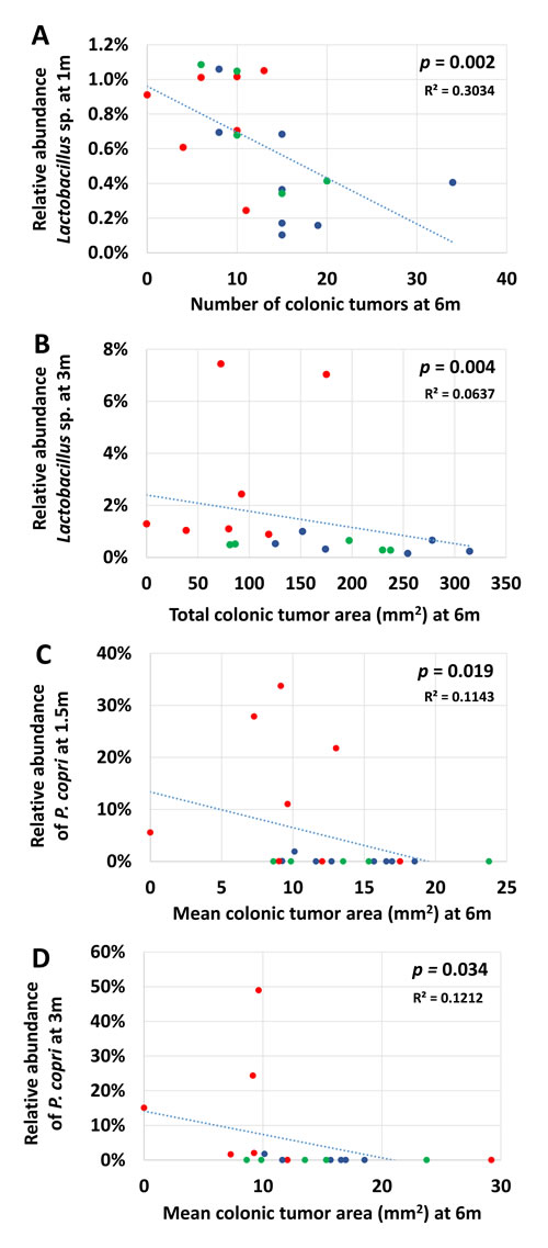 Significant correlations were also detected between the relative abundance of P. copri and mean colonic tumor area at 1.5m and 3m (Figure 6C and 6D; p = 0.019 and 0.039, respectively), with a similar, albeit insignificant (p = 0.084), trend at 1m. There were also trends toward a protective effect of P. copri at 1m and 3m with regard to total colonic tumor area (p = 0.097 and 0.091, respectively). These findings may reflect the overall disparity in relative abundance of P. copri between GM profiles as the correlations failed to achieve significance when data were stratified with GM.