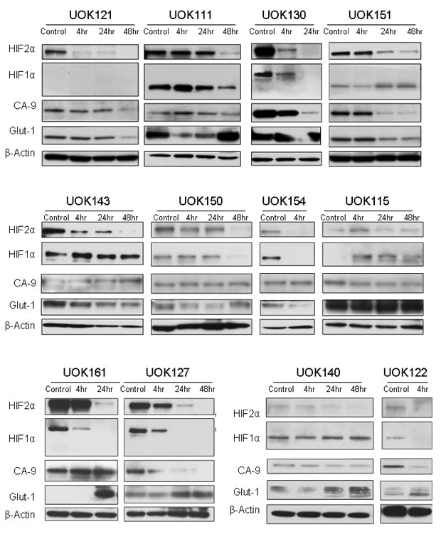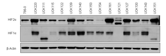 We first characterized the HIFα status of 15 RCC cell lines with mutated VHL gene (Figure 1 and Table 1). All of the cells expressed HIF2α, but some, including 786-0 [7], UOK111, UOK121 and UOK151 did not express HIF1α or expressed a shorter 75kDa splice isoform. Interestingly although expressed in UOK154, HIF2α protein levels were low relative to other VHL-deficient cells.