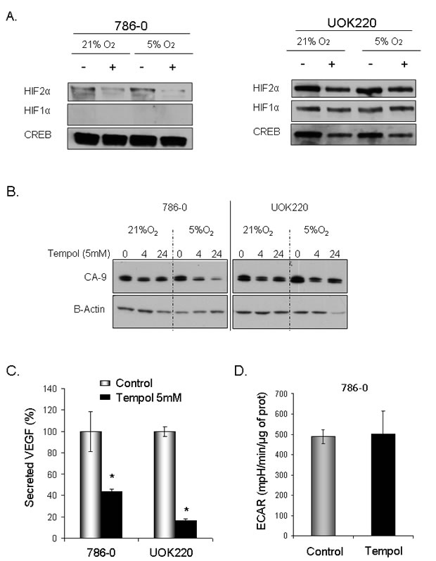 Figure 3: Tempol decreases HIF2α nuclear activity. A. To assess the effect of Tempol on HIFα nuclear activities, expression of HIFα was assessed in 786-0 and UOK220 cells following Tempol treatment (5mM, 24h) and using 30μg nuclear lysates extracted at 21% or 5% O2. B. The effect of Tempol treatment (5mM, 24h) on the HIF2α transcriptional target, carbonic anhydrase 9 (CA-9), was visualized by immunoblotting using 20μg of whole cell extracts (786-0 and UOK220 cells). C. The effect of Tempol on another HIF2α transcriptional target VEGF was assessed by measuring the amount of VEGF secreted in the media of 786-0 and UOK220 cells after Tempol treatment (5mM, 24h). Secreted VEGF was quantified by ELISA using the MesoScale discovery (MSD) technology. D. The effect of Tempol on 786-0 cells’ metabolism was assessed using the Seahorse Bioscience technology.