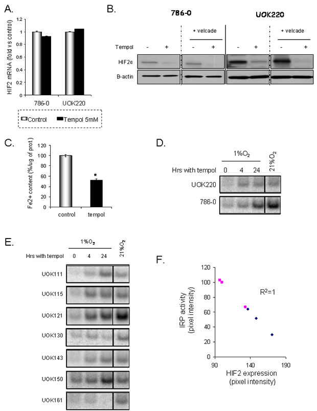 Figure 5: Tempol translationaly inhibits HIF2α. A. The effect of Tempol (5mM, 24h) on HIF2α transcription was assessed by semi-quantitative RT-PCR in 786-0 and UOK220 cells. B. The effect of Tempol (5mM, 24h) on HIF2α protein degradation was assessed by treating the cells with the proteasome inhibitor velcade (1µM, 24h). HIF2α expression was then assessed by immunoblotting using 20μg of whole cell lysates. C. The amount of available ferrous iron (Fe2+) content was measured after Tempol treatment (5mM, 24h) in 786-0 cells. D-E. IRP1 activities of different CCRCC cell lines were measured at 1% and 21% O2 and following Tempol treatment (5mM, 24h). F. Correlation between HIF2α expression and IRP1 activity (R2 =1).