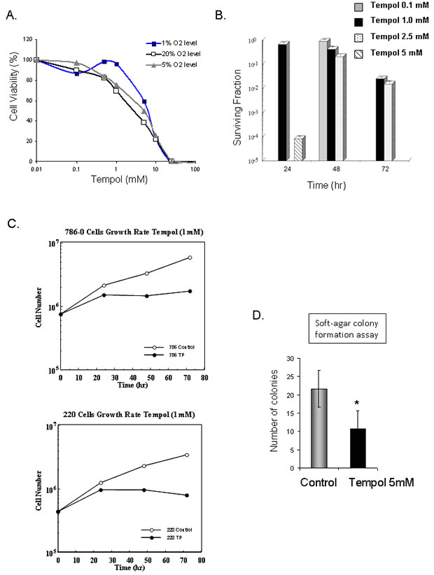 Figure 6: Anti-tumor effect of Tempol in CCRCC. A. The cytotoxic effect of Tempol in 786-0 cells was assessed by MTT after 48h treatment at 1%, 5% and 20% O2. B. Cell viability following Tempol treatment was assessed by clonogenic assay in 786-0 cells. C. Effect of Tempol (1mM) on cell proliferation in 786-0 and UOK220 cells. D. The effect of Tempol (5mM) on the anchorage-independent growth ability of 786-0 cells was assessed by soft-agar colony formation assay.