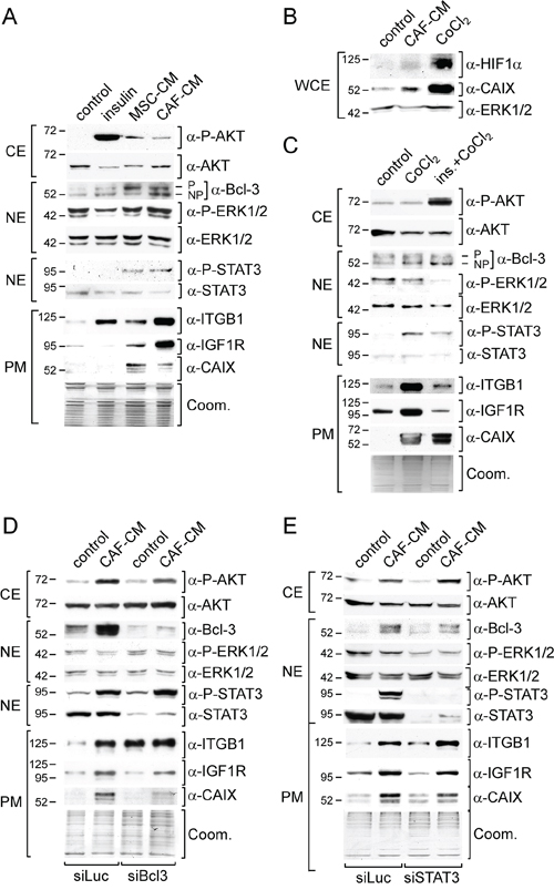 Figure 2: MSC- and CAF-CM upregulate the activities of signaling pathways and expression of proteins relevant in the acquisition of drug resistance. Western blot analyses of the indicated proteins and phospho-proteins were performed after MCF-7 cells were incubated with insulin, 100 μM CoCl2, insulin plus CoCl2 (ins./CoCl2), MSC- or CAF-CM and/or transfected with siBcl3, siSTAT3 or with the control siRNA siLuc. Depending on the cellular location of the protein or phospho-protein, either the cytosolic (CE), nuclear (NE) or plasma membrane (PM) extract was used for the analysis A–C, E. For the visualization of the HIF1α protein, whole cell extracts (WCE) were prepared by lysing cells in RIPA buffer B. To check for equal loading of plasma membrane proteins, proteins remaining in the gel after blotting were stained with Coomassie Blue (Coom.).