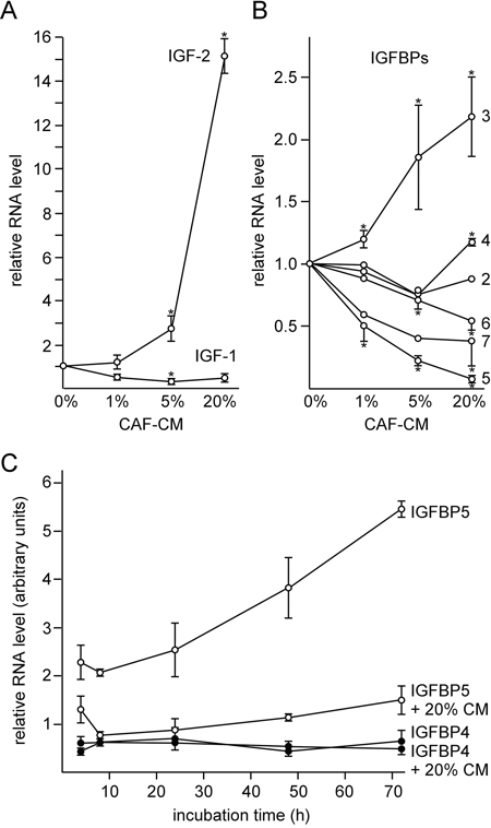 Figure 3: CAF-CM induces the downregulation of IGFBP5 expression. A, B. RT-PCR analyses of RNA isolated from MCF-7 cells after 2-day-exposure to 0, 1, 5 or 20% CAF-CM for the abundance of IGF-1/-2 specific mRNAs (A) and IGFBP1-7-specific mRNAs (B). C. Time-course study to measure changes in IGFBP4/5 mRNA levels in MCF-7 cells within 4–72 h after addition of 20% CAF-CM or no addition of CAF-CM.