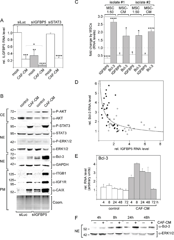 Figure 4: Knock-down of IGFBP5 mimics most of the CAF-CM-induced effects on signaling pathways and protein expression. A. RT-PCR analysis of IGFBP5 mRNA levels in MCF-7 cells transfected with siIGFBP5, siSTAT3 or siLuc (control siRNA) followed by treatment with CAF-CM or no treatment. B. Western blot analyses of levels of stromal cell-regulated proteins and phospho-proteins after treatment of MCF-7 cells with siIGFBP5 or siLuc in the presence or absence of CAF-CM (CE = cytosolic extract, NE = nuclear extract, PM = plasma membrane extract). To check for equal loading of plasma membrane proteins, proteins remaining in the gel after blotting were stained with Coomassie Blue (Coom.) C. Effects of two different human MSCs isolates on IGFBP5 and Bcl-3 levels in MCF-7 cells. Either MSCs were co-cultured with MCF-7 cells in a ratio of 1:50 or 20% MSC-CM was added to the MCF-7 cells. D. RT-PCR analyses of RNAs isolated from MCF-7 cells treated with CAF-CM (•) or from untreated MCF-7 cells (○) for IGFBP5 and Bcl-3 mRNA levels. E, F. Comparison of the Bcl-3 mRNA RNA (E) and protein (F) levels in the presence and absence of CAF-CM in a time course experiment. For each time point, the difference in Bcl-3 expression between control cells and CAF-CM-treated cells is statistically significant as determined by paired sample student's t-test. In (A, D, F), each bar represents the mean value ± S.D. of at least three independent experiments.