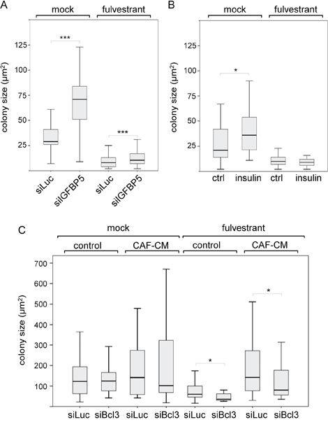 Having established that downregulation of IGFBP5 allows MSCs and CAFs to coordinate a number of events, we explored the possibility that a decline in the IGFBP5 level also affects colony growth of MCF-7 cells. By using siIGFBP5, we found that a decrease in IGFBP5 expression resulted in an increase in average colony size both in the absence and presence of fulvestrant (Figure 5A). To check whether the PI3K/AKT pathway was responsible for these effects, we repeated the experiments with insulin. While insulin was able to significantly increase average colony growth in the absence of fulvestrant, it failed to do so in the presence of fulvestrant (Figure 5B). This suggests that the effect of siIGFBP5 on growth in the presence of fulvestrant was not caused by the activation of the PI3K/AKT pathway. Next, we tested whether Bcl-3 may affect MCF-7 cell growth. Strikingly, siBcl-3 did not significantly alter cell growth in the absence of fulvestrant, but selectively reduced growth in the presence of fulvestrant, most profoundly in the presence of CAF-CM (Figure 5C). This suggests that the increased expression of Bcl-3 caused by stromal cell-induced downregulation of IGFBP5 is at least partially responsible for stromal cell-mediated fulvestrant resistance.