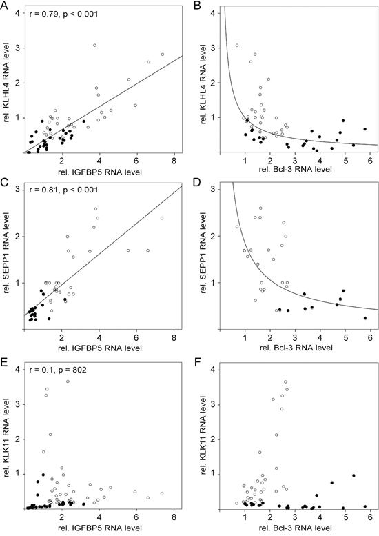 Figure 6: KLHL4 and SEPP1 mRNA levels change along with the IGFBP5 mRNA level in a linear fashion. A–F. RT-PCR analyses of RNA isolated from MCF-7 cells either exposed to CAF-CM (•) or left untreated (○). Levels of KLHL4-, SEPP1- and KLK11-specific mRNAs were either compared with the mRNA level of IGFBP5 (A, C, E) or with the mRNA level of Bcl-3 (B, D, F).