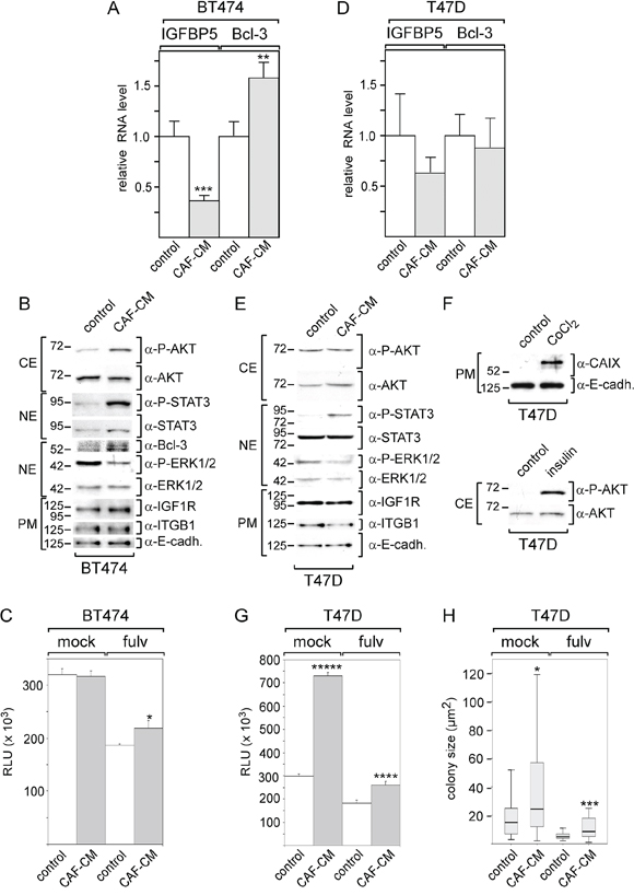 Figure 7: BT474, but not T47D cells respond to CAF-CM by changing IGFBP5 and Bcl-3 levels and by increasing growth activity in the presence of fulvestrant. A–D. After BT474 cells (A, B) or T47D cells (D, E.) were treated with CAF-CM or left untreated for three days, RNA or proteins were isolated and analyzed for IGFBP5 and Bcl-3 RNA levels (A, D) or levels of certain proteins as indicated (B, E), respectively. To check for equal loading of plasma membrane proteins, blots were reprobed with an E-cadherin -specific antibody (α-E-cadh.). F. T47D cells were also tested for AKT phosphorylation and CAIX expression after 3-day-treatment with insulin or CoCl2, respectively. (C, G, H.) Effect of CAF-CM on BT474 and T47D cell growth in the presence or absence of fulvestrant as measured either by an ATP based assay (C, G) or by measuring the sizes of single colonies (H). In (A, C, D, G), each bar represents the mean value ± S.D. of at least three independent experiments, in (H), the data of a representative experiment are shown. Statistical analysis was either performed by using the student's t-test (A, C, D, G) or the Wilcoxon test (H).