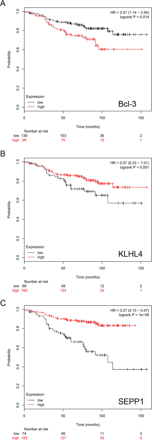 We next sought to analyze whether Bcl-3 is associated with the outcome of breast cancer patients that suffered from ERα/PR-positive tumors and received endocrine treatment. For this reason, we performed an in-silico analysis by using the Kaplan-Meier-Plotter available under http://kmplot.com/analysis/index.php?p=service&default=true which is based on data published by Gyorffy et al. [43]. The selected criteria (ERα+/PR+/received endocrine treatment) were met by a cohort of 229 patients. The analysis for this cohort revealed that higher Bcl-3 mRNA levels were significantly associated with a more unfavorable relapse-free survival (Figure 8A). We also run the analysis for KLHL4 and SEPP1, whose expression could be increased by siBcl-3 and showed an inverse correlation to that of Bcl-3. For these two genes, higher mRNA levels correlated with a better relapse-free survival (Figure 8B, 8C). While the data for KLHL4 slightly missed the significance level (p = 0.051) (Figure 8B), those for SEPP1 were highly significant (Figure 8C). Collectively, these data are consistent with the notion that Bcl-3 is involved in endocrine resistance and that KLHL4 and SEPP1 are negatively regulated by Bcl-3. The data might also suggest that Bcl-3 mediates endocrine resistance at least partially by downregulating KLHL4 and SEPP1.