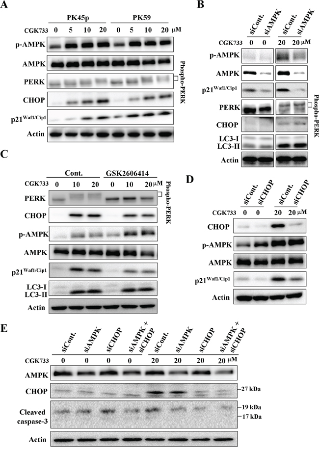 Figure 3: CGK733 induced AMPK phosphorylation and PERK/CHOP activation. A. PK45-p and PK59 cells were treated with CGK733 for 6 h before being processed for Western blot analysis. B. PK45-p cells were treated with CGK733 for 6 h after transfection with AMPK siRNA for 48 h. C. PK45-p cells were treated with CGK733 for 6 h in the presence or absence of 1 μM of PERK inhibitor (GSK2606414) before analysis by Western blot. D. PK45-p cells were treated with CGK733 for 6 h after transfection with CHOP siRNA for 48 h. E. PK45-p cells were treated with CGK733 for 6 h after transfection with AMPK and/or CHOP siRNAs for 48 h.