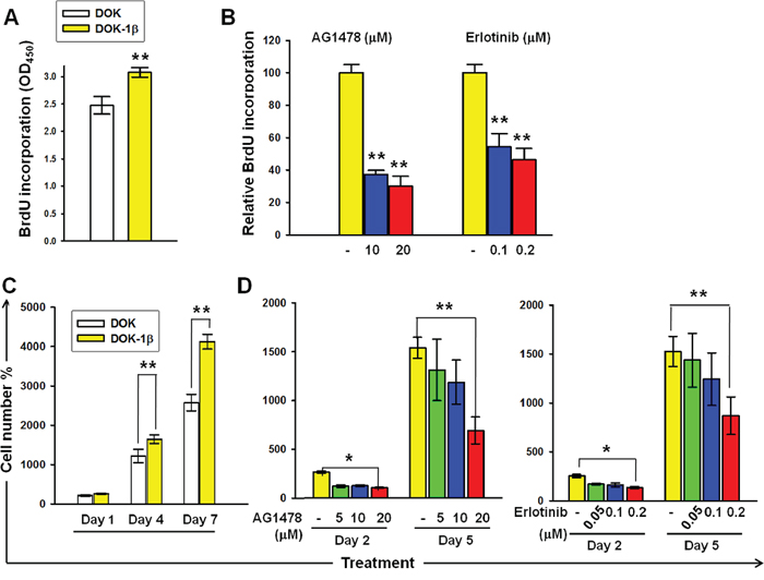 Figure 1: DOK proliferation in response to IL-1β is dependent on EGFR kinase activity. A. BrdU incorporation was higher in DOK-1β cells than in the DOK cells. B. EGFR-TKIs AG1478 and erlotinib suppressed BrdU incorporation in DOK-1β cells in a dose-dependent manner. C. Increased DOK-1β cell proliferation was measured using the MTT assay. D. Dose-dependent inhibition effects of AG1478 and erlotinib on the DOK-1β proliferation were measured using the MTT assay. Cells were seeded at 5 × 104 (BrdU assay) or 5 × 103 (MTT assay) cells per well on 96-well plates. The next day, cells were treated with DMSO (controls), AG1478, and erlotinib at the indicated concentrations. After a 4-hour treatment, cells were cultured in a normal growth medium, and proliferation assays were performed either after 1 day of treatment, using the BrdU assay, or after 2 and 5 days of treatment, using the MTT assay. Data are expressed as mean ± SD of three independent experiments, where each experiment has been performed in six replicates. *P ≤ 0.01 versus untreated controls.