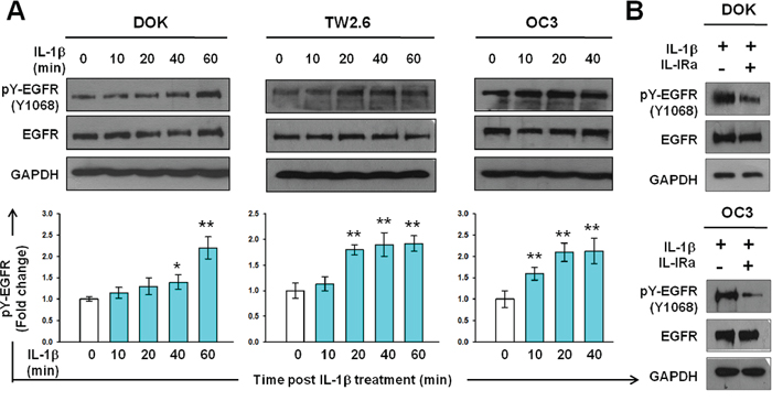 Figure 2: IL-1β induces EGFR tyrosine phosphorylation in DOK and OSCC cell lines. A. Kinetics of EGFR tyrosine phosphorylation in response to IL-1β in DOK and OSCC cell lines. Cells were cultured in serum-free medium for 24 hours and then treated with IL-1β (1 ng/mL, blue bar). Cell lysates were harvested on ice at the indicated times after IL-1β addition. Equal amounts of whole cell lysates were analyzed for phospho-EGFR (pY-EGFR) and total EGFR protein levels using Western blotting. A representative blot is shown in the top panel. Densitometric analyses were performed to quantify the intensity of the blots. Data are expressed as mean ± SD (n = 3). *P < 0.05 versus basal activation. B. IL-1 receptor antagonist (IL-1Ra) inhibits IL-1β-mediated EGFR tyrosine phosphorylation. Cells were pretreated with or without 100 μg/mL of IL-Ra for 2 hours prior to IL-1β (1 ng/mL) addition. Cell lysates were harvested on ice 16 hours post IL-1β addition. Whole cell lysates were analyzed using Western blotting, as described in (A).