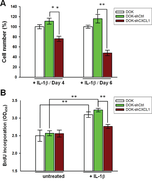 Figure 6: Knockdown of CXCL1 reduces IL-1β-mediated proliferation in DOK cell line. DOK cells were infected with a nontargeting control vector (shCtrl) or CXCL1 shRNA (shCXCL1), inducing puromycin resistance. Cells were cultured for at least 2 weeks in the presence of puromycin (5 μg/mL) before the addition of 1 ng/mL of IL-1β. Cell proliferations were analyzed using MTT method A. or BrdU incorporation method B. as described in Figure 1. Data are expressed as mean ± SD of three independent experiments, where each experiment has been performed in sixplicates. **P < 0.01 versus the nontargeting control.