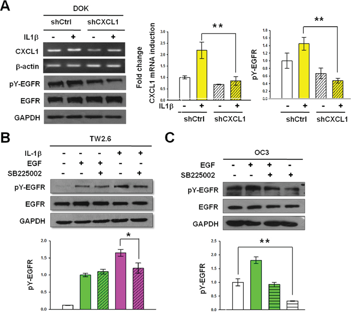 Figure 7: CXCL1 and CXCR2 are required for IL-1β-mediated EGFR tyrosine phosphorylation. A. Knockdown of CXCL1 inhibits basal and IL-1β-mediated EGFR tyrosine phosphorylation. Nontargeting control cells (shCtrl) and CXCL1-targeting shRNA cells (shCXCL1) derived from DOK were established as described in Figure 6. After serum starvation, cells were treated with IL-1β (1 ng/mL). Cell lysates and total RNA were harvested 2 hours after IL-1β addition. CXCL1 mRNA expression and EGFR tyrosine phosphorylation were analyzed and quantified as described in Figures 3A and 2A, respectively. Representative blots are shown. Data are expressed as mean ± SD (n = 3). **P < 0.01 versus untreated or IL-1β-treated nontargeting control cells. B. Inhibition of IL-1β-mediated EGFR phosphorylation by CXCR2 antagonist SB225002. TW2.6 cells in serum-free medium were treated with 200 nM SB225002 for 20 min and followed by 1 ng/mL of IL-1β stimulation for 20 min. C. Inhibition of constitutive EGFR phosphorylation by SB225002. Experiments were conducted using OC3 cells following the procedure described in (B), except without IL-1β stimulation. EGFR tyrosine phosphorylation was analyzed and quantified as described in Figure 2A. Data are expressed as mean ± SD (n = 3), *P < 0.05 and **P < 0.01 versus IL-1β-mediated activation (B) or basal activation (C).