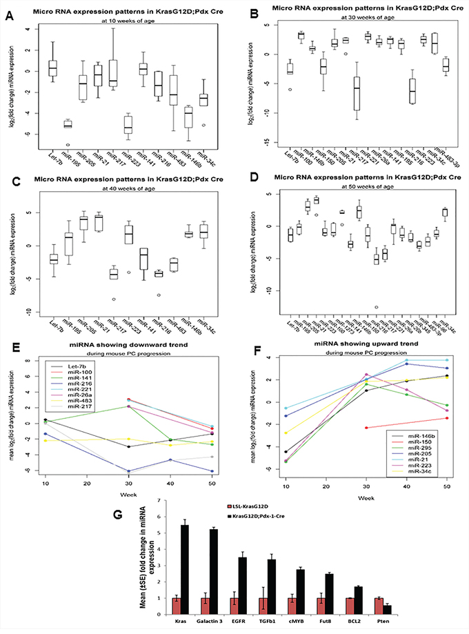 Figure 2: Expression profiles of miRNAs during the mouse PC progression in KrasG12D; Pdx1-Cre mice and their contemporary littermate animals. A, B, C, D. Expression patterns of miRNA at 10, 30, 40, and 50 weeks of PC progression was analyzed by real-time PCR, using TaqMan assays specific for individual miRNAs. U6 snRNA was used as an internal control for normalization. The fold change was calculated by ΔΔCt method. E. and F. Showing trends of miRNA expression during the mouse PC progression.