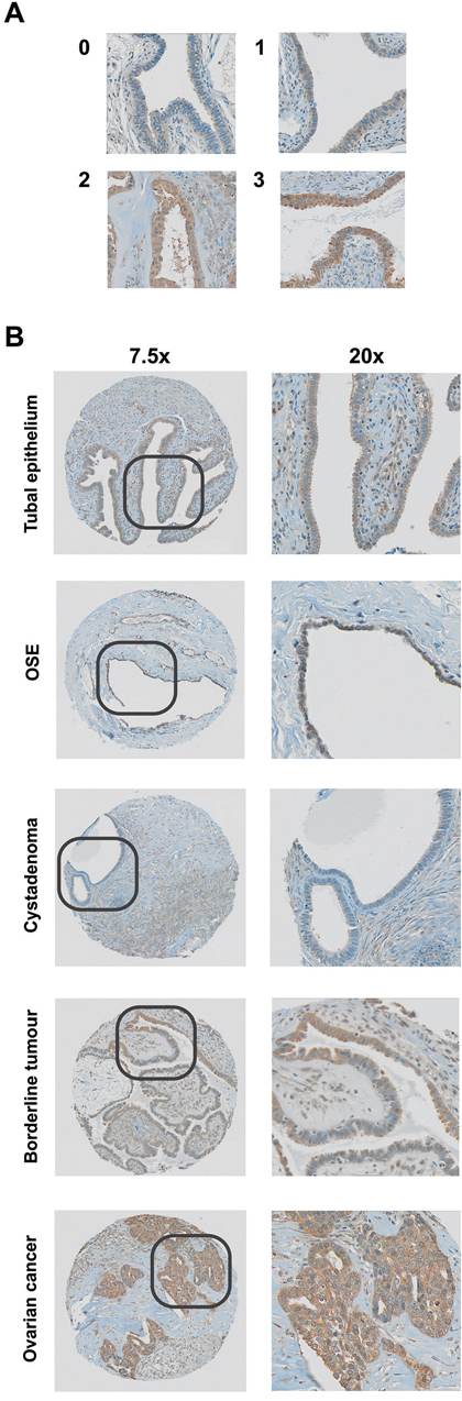 Figure 1: ROR2 protein expression as measured by immunohistochemistry. A. Representative staining at 0, 1, 2 and 3 intensity. B. Representative IHC staining in tubal epithelium, ovarian surface epithelium (OSE), cystadenoma, borderline, and ovarian cancer samples.