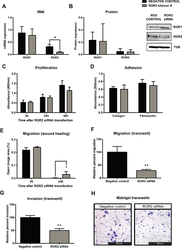 Figure 3: Knockdown of ROR2 in serous ovarian cancer cells inhibits cell migration. A. ROR2 is decreased at the mRNA level following siRNA (A) induced knockdown in serous ovarian cancer (OVCAR3) cells. No effect on ROR1 mRNA level. qRT-PCR was performed in triplicate and normalised to three different housekeeping genes (SDHA, HSPCB, RPL13A). Results represent an average of four experiments. Error bars represent the s.d of the mean. **P < 0.01. B. Densitometric analysis of ROR1 and ROR2 protein levels from three separate experiments. Representative immunoblots showing ROR2 knockdown at the protein level in OVCAR3 cells. No effect on ROR1 protein level. Top panel: ROR1, middle panel: ROR2, bottom panel: α-tubulin. C. Cell proliferation is slightly decreased following ROR2 knockdown in OVCAR3 cells over a 48–72 hours period, but not significantly. Results represent the average of three independent experiments. Error bars represent the s.d of the mean. D. ROR2 knockdown has no effect on the adhesion of OVCAR3 cells to collagen or fibronectin. Results represent the average of 3 experiments. E. Cell migration performed using the wound healing assay is significantly decreased following ROR2 knockdown in OVCAR3 cells. Results represent an average of three experiments. Error bars represent the s.d of the mean. *P < 0.05. F. Relative cell migration performed using the transwell migration assay is significantly decreased following ROR2 knockdown in OVCAR3 cells. Results represent an average of three experiments. Error bars represent the s.d of the mean. **P < 0.01. G. Relative cell invasion performed using the matrigel pre coated transwell assay significantly decreased following ROR2 knockdown in OVCAR3 cells. Results represent the average of three experiments. Error bars represent the s.d of the mean. **P < 0.01. H. Representative picture of OVCAR3 cells invading matrigel over 48 hours.
