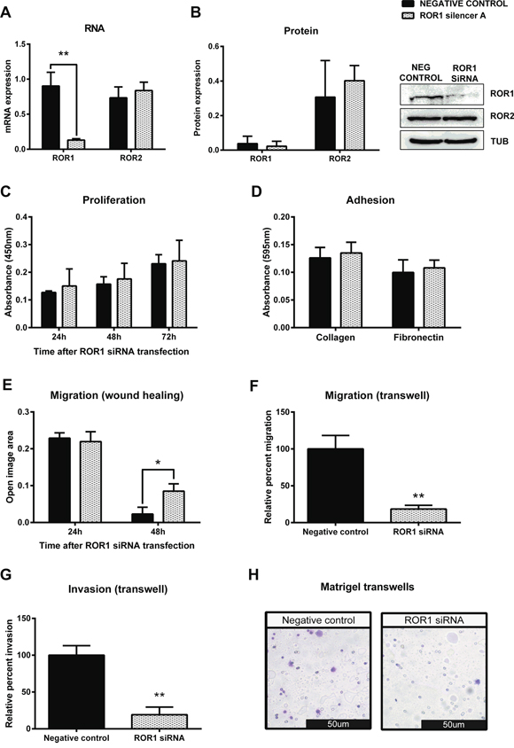 Successful transfection of ROR1 siRNA significantly decreased mRNA (Figure 4A, p < 0.01) and protein (Figure 4B) levels of ROR1, and had no effect on the level of ROR2 (Figure 4A–4B) in the OVCAR3 cell line. ROR1 knockdown had no effect on cell proliferation (Figure 4C), nor on cell adhesion to collagen or fibronectin (Figure 4D). However, ROR1 knockdown in OVCAR3 significantly decreased cell migration in both the 2D wound healing assay (Figure 4E, p < 0.05) and the 3D transwell assay (Figure 4F, p < 0.01). In addition, ROR1 knockdown significantly inhibited the invasive ability of OVCAR3 cells (Figure 4G–4H, p < 0.01).