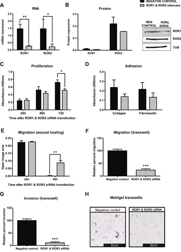 As the OVCAR3 cell line expressed both ROR1 and ROR2, we were interested to investigate the synergistic effect of ROR1 and ROR2 on cancer cell behaviour. Successful co-transfection of ROR1 and ROR2 siRNA significantly decreased mRNA (Figure 5A, p < 0.01) and protein (Figure 5B) levels of ROR1 and ROR2. Double knockdown of ROR1 and ROR2 significantly decreased cell proliferation 72 hours after transfection (Figure 5C p < 0.05), and reduced adhesion to collagen and fibronectin, though this did not reach significance (Figure 5D). Most interestingly, ROR1 and ROR2 knockdown in OVCAR3 significantly decreased cell migration in the 2D wound healing assay (Figure 5E, p < 0.001) and 3D transwell migration assays (Figure 5F, p < 0.001). This inhibition was stronger than that seen with ROR1 or ROR2 knockdown alone. Similarly, this synergistic effect was also observed in the transwell invasion (Figure 5G–5H, p < 0.001) assays, where the double ROR knockdown dramatically halted the ability of the OVCAR3 cells to invade through a layer of matrigel.