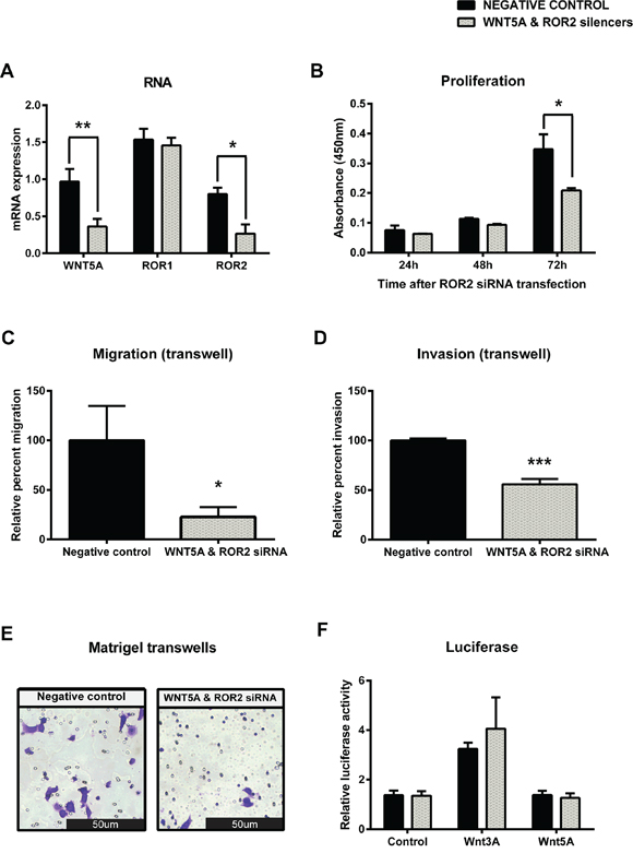 To investigate mechanisms of ROR signalling in the OVCAR3 cell line, the putative ROR ligand, Wnt5a was also silenced using siRNA. Successful transfection of Wnt5a siRNA significantly decreased mRNA (Figure 6A, p < 0.01) levels of Wnt5a, and significantly decreased cell proliferation 72 hours after transfection (Figure 6B p < 0.05). Migration and invasion of OVCAR3 was also significantly inhibited by Wnt5a knockdown (Figure 6C–6E p < 0.05). A luciferase assay was used to investigate TCF/LEF transcriptional activity and thus the activation of the β-catenin dependent pathway. Interestingly there was no change in activity between the control and Wnt5a knockdown cells (Figure 6F).