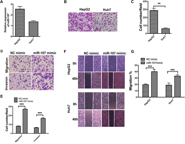 Figure 3: Overexpression of miR-107 promotes the migration and invasion of human HCC cells. A–C. The miR-107 level was detected using qRT-PCR (A) in the two cell lines and the transwell assay without Matrigel was performed. Representative photos (B) and quantitative analysis (C) are shown. D–E. Transwell assays with and without Matrigel were performed with the Huh7 cells transfected with the NC mimic and the miR-107 mimic. Representative photos (D) and quantitative analysis (E) are shown. F–G. Wound-healing assays were performed to evaluate the effect of miR-107 on the migratory ability of the two cell lines. The artificial gap was made through the central axis when the cells reached a density of 80%. Photos of the cells were taken at 0 and 48 h (F) The relative migration length was from three randomly selected locations (G) (*P < 0.05; **P < 0.01; ***P < 0.001).