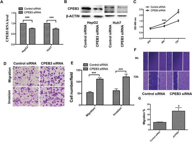 Figure 5: CPEB3 inhibition accelerates the proliferation and metastasis of human HCC cells. A. The Huh7 and HepG2 cells were transfected with negative control (siNC) and CPEB3 siRNA (siCPEB3). The mRNA level and protein level of CPEB3 after interference were detected using qRT-PCR and western blotting. C. Huh7 cells were used in the MTT assay after transfection of siNC and siCPEB3. D–E. Downregulated CPEB3 promoted the migratory and invasive ability of the Huh7 cells. The transwell assays with and without Matrigel were performed in Huh7 cells transfected siNC and siCPEB3. Representative photos (D) and quantitative analysis (E) are shown. A wound-healing assay was performed using the same cells as is (D), and the photos were taken at 0 h and 72 h F–G. Relative migration length was from three randomly selected locations (*P < 0.05; **P < 0.01; ***P < 0.001).
