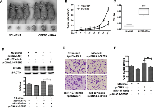 Figure 6: CPEB3 is involved in miR-107-induced growth and migration in HCC cells. A. Tumors formed in nude mice. The hepG2 cells transfected with CPEB3 siRNA and negative control were subcutaneously injected into nude mice. B. The volumes of tumors were determined and CPEB3 interfering resulted in the promotion of the growth rate. C. Tumors and the bodies were weighted and showed as tumor weight/body weight (TW/BW). D. Huh7 cells were co-transfected with the miR-107 mimic (or NC mimic) and the CPEB3 expression vector (or pcDNA 3.1(+)). The expression of CPEB3 was detected by western blot. E–G. The cells transfected as in (D) were used to perform the MTT and transwell assays (*P < 0.05; **P < 0.01; ***P < 0.001).