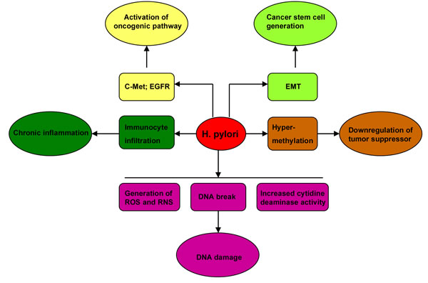 Figure 2: The mechanisms underlying gastric carcinogenesis induced by H. pylori. The mechanisms include chronic inflammation in gastric mucosa, genetic and epigenetic alterations of tumor suppressor genes, activation of oncogenic signals, and generation of gastric cancer stem cells (CSC).