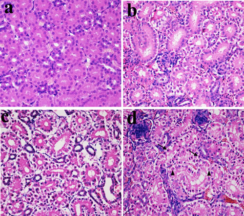 Figure 2: Histopathological changes in the kidney at 28 days of age. a. Control group. No changes are observed (H•E ×400). b. 300 mg/kg group. Tubular cells show granular degeneration (H•E ×400). c. 600 mg/kg group. Tubular cells show obvious granular and vacuolar degeneration. Also, few necrotic tubular cells and apoptotic tubular cells are observed (H•E ×400). d. 900 mg/kg group. Tubular cells show marked granular and vacuolar degeneration. Also, some necrotic tubular cells (▲) and apoptotic tubular cells (↑) are observed (H•E ×400).