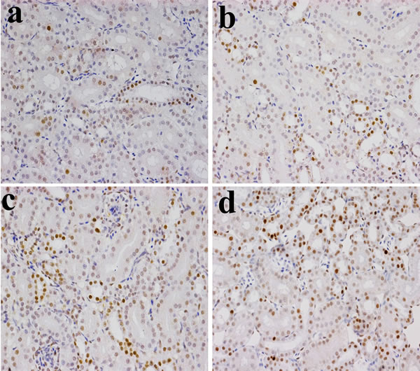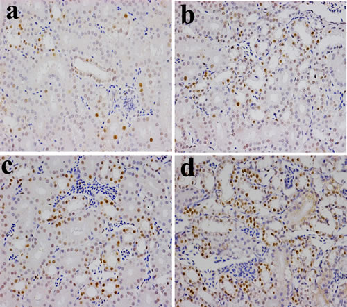 As described by Wu et al. [18], renal slices were dewaxed in xylene, rehydrated through a graded series of ethanol solutions, washed in distilled water and PBS and endogenous peroxidase activity was blocked by incubation with 3% H2O2 in methanol for 15 min. The sections were subjected to antigen retrieval procedure by microwaving in 0.01 M sodium citrate buffer pH 6.0. Additional washing in PBS was performed before 30 min of incubation at 37 °C in 10% normal goat serum (Boster, Wuhang, China). The slices were incubated overnight at 4 °C with anti-NF-κB (phospho S536) (1:100) antibody (bs-0465R, Bioss, Beijing, China). After washing in PBS, the slices were exposed to 1% biotinylated goat anti-mouse IgG secondary antibody (Boster, Wuhang, China) for 1 h at 37 °C, and then incubated with strept avidin-biotin complex (SABC; Boster, Wuhang, China) for 30 min at 37 °C. To visualize the immunoreaction, sections were immersed in diaminobenzidine hydrochloride (DAB; Boster, Wuhang, China). The slices were monitored microscopically and stopped by immersion in distilled water, as soon as brown staining was visible. Slices were lightly counterstained with hematoxylin, dehydrated in ethanol, cleared in xylene and mounted. In the slices, the NF-κB protein was brown-stain.