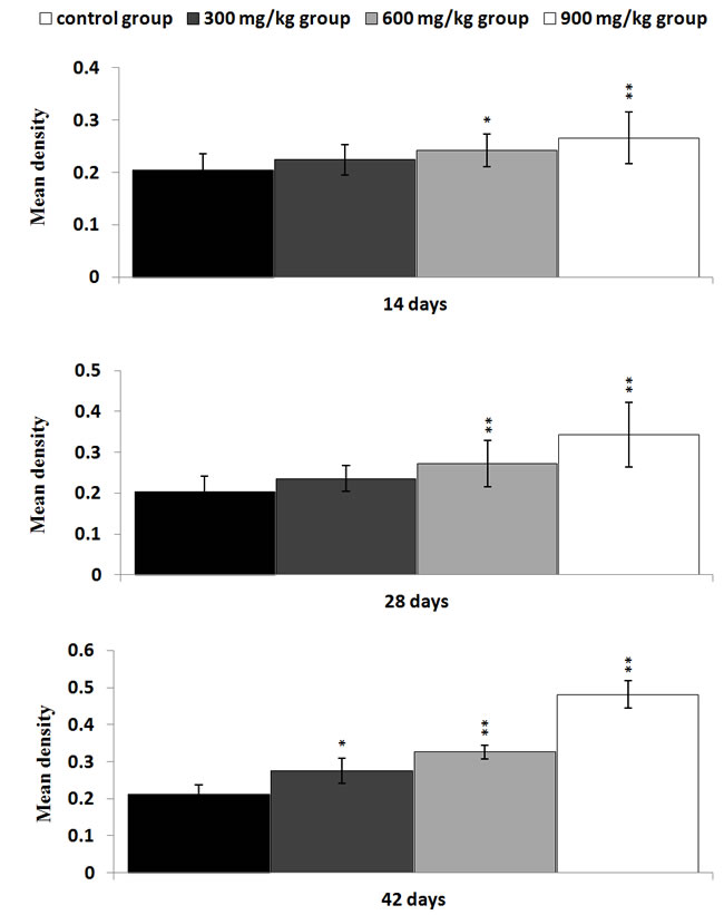 Figure 7: Changes of the mean density of NF-κB protein expression in the kidney Data are presented with the mean ± standard deviation (n=5×5) *P<0.05, compared with the control group **P<0.01, compared with the control group.