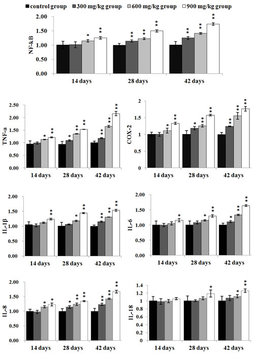 The NF-κB, TNF-α, COX-2 and IL-8 mRNA expression levels were significantly higher (P < 0.05 or P < 0.01) in the 300 mg/kg group at 28 and 42 days of age, and in the 600 mg/kg, 900 mg/kg groups from 14 to 42 days of age than those in the control group. The IL-1β and IL-6 mRNA expression levels were significantly increased (P < 0.05 or P < 0.01) in the 900 mg/kg group at 14 days of age, and in the 300 mg/kg group at 42 days of age, and in the 600 mg/kg, 900 mg/kg groups at 28 and 42 days of age when compared with those in the control group. The IL-18 mRNA expression levels were significantly increased (P < 0.05 or P < 0.01) in the 900 mg/kg group at 28 days of age, and in the 600 mg/kg and 900 mg/kg groups at 42 days of age in comparison with those in the control group. The results were shown in Figure 8.