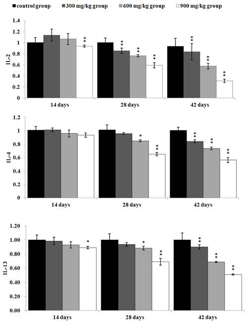 In Figure 9, the IL-2 mRNA expression levels were significantly lower (P < 0.05 or P < 0.01) in the 300 mg/kg, 600 mg/kg and 900 mg/kg from 28 to 42 days of age than those in the control group. The IL-4 and IL-13mRNA expression levels were significantly decreased (P < 0.05 or P < 0.01) in the 600 mg/kg and 900 mg/kg group at 28 days of age, and in the 300 mg/kg, 600 mg/kg, 900 mg/kg groups at 42 days of age in comparison with those in the control group. The IL-13 mRNA expression levels were significantly reduced (P < 0.05 or P < 0.01) in the 900 mg/kg group at 14 days of age.