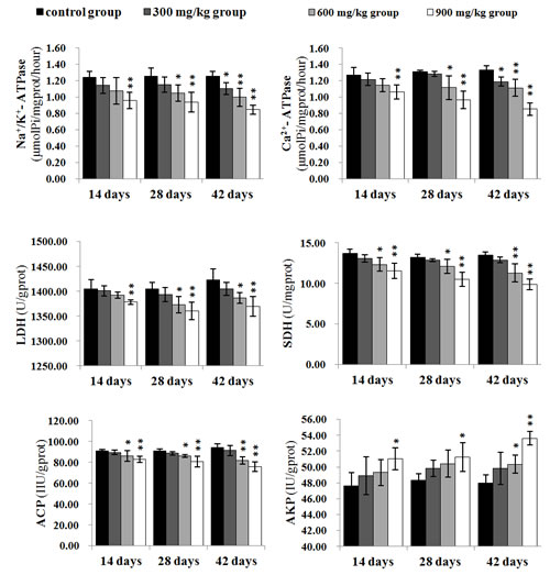 The Na+/K+-ATPase and Ca2+-ATPase activities were significantly lower (P < 0.05 or P < 0.01) in the 900 mg/kg group at 14 days of age and in the 300 mg/kg, 600 mg/kg and 900 mg/kg groups at 28 and 42 days of age than those in the control group, except the Na+/K+-ATPase and Ca2+-ATPase activities in the 300 mg/kg group at 28 days of age. The LDH activities were significantly decreased (P < 0.05 or P < 0.01) in the 900 mg/kg group at 14 days of age, and in the 600 mg/kg, 900 mg/kg groups at 28 and 42 days of age. The SDH and ACP activities were significantly lower (P < 0.05 or P < 0.01) in the 600 mg/kg and 900 mg/kg groups from 14 to 42 days of age than those in the control group.