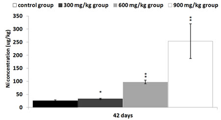 Figure 11: Changes of Ni contents in the kidney at 42 days Data are presented with the mean ± standard deviation (n=5) *P<0.05, compared with the control group **P<0.01, compared with the control group.