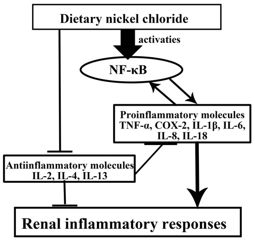 Figure 12: Mechanisms of NiCl2-cauced renal inflammatory responses Dietary NiCl2 in excess of 300 mg/kg induces increase of the pro-inflammatory mediator mRNA expression levels via NF-κB pathway and decrease of the anti-inflammatory mediator mRNA expression levels, which causes inflammatory responses in the kidney.
