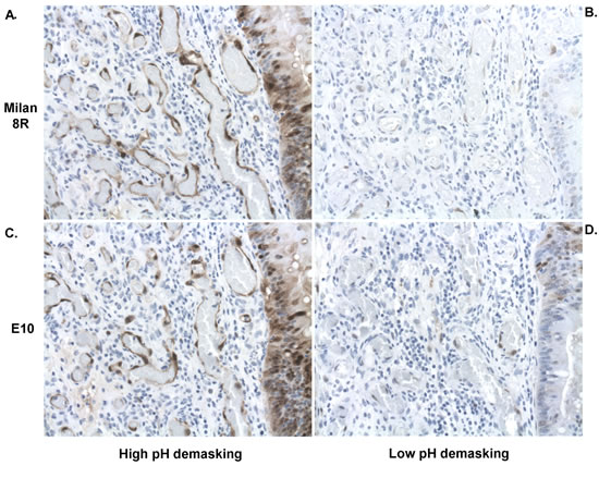 Figure 1: Adjacent sections of pretreatment biopsies demonstrating effects of high A., C. and low B., D. pH demasking on staining with the Milan8R A., B. and E10 C., D. pERK antibodies. Note vastly more intense staining with both antibodies after high pH demasking. Staining occurs in both nuclei and cytoplasm but is most intense in nuclei. Both endothelial cells and tumor cells (right) are stained following appropriate demasking.