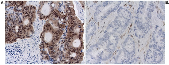 Figure 2: Staining for pERK (Milan8R antibody) in cancer and stromal cell nuclei. A. Pretreatment biopsy showing strong staining for pERK in cancer cell nuclei and less staining in stromal cell nuclei (TRG4). B. Pretreatment biopsy showing strong staining for pERK in stromal cell nuclei and no staining of cancer cell nuclei (TRG1).
