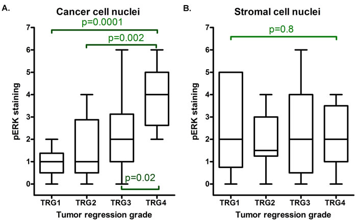 Figure 4: Box and whiskers plot demonstrating results of blind scorings of cancer and stromal cell nuclear staining with the pERK (Milan8R) antibody. Averages of scorings from two observers are presented. Note that cancer cell nuclear staining A., but not stromal cell nuclear staining B., increases with the tumor regression grade (TRG1 identifies total tumor regression). Horizontal lines identify medians, boxes identify interquartile ranges and whiskers identify total ranges of scorings. The p values indicated in the figure refer to Mann-Whitney U tests of differences between individual groups. A Kruskal-Wallis test of all groups returns p = 0.001 for cancer cell nuclear staining and p = 0.990 for stromal cell nuclear staining.