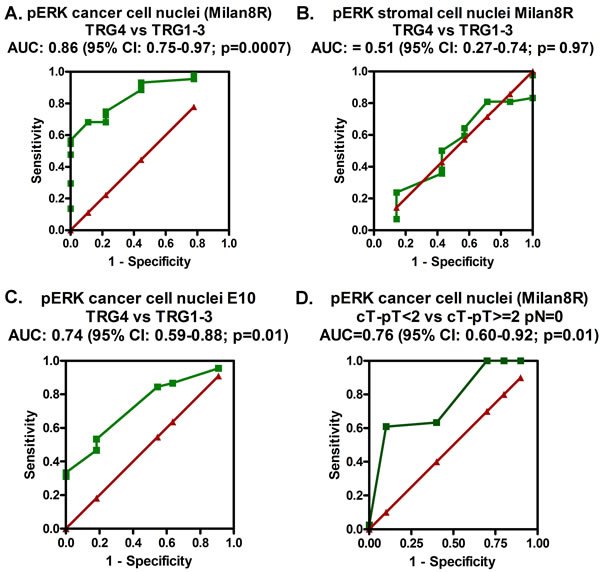 Figure 5: ROC curves (green) demonstrating the prediction accuracy (TRG4 vs. TRG1-3) of staining of cancer cell nuclei A. and stromal cell nuclei B. with the pERK (Milan8R) antibody and of staining of cancer cell nuclei C. with the pERK (E10) antibody as well as the prediction accuracy for downstaging (defined as being equal to or exceeding a reduction of 2 in the clinical versus pathological T stage with no positive lymph nodes as detected by pathological examination) of staining of cancer cell nuclei with the pERK (Milan8R) antibody D. The red lines illustrate imaginary curves, which show no prediction accuracy (AUC = 0.5).
