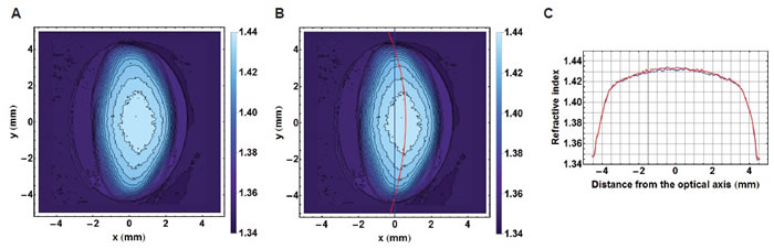 Figure 3: A. Iso-indicial contours in the sagittal plane of a 52 year-old human lens; B. the true equatorial plane running through the centre of each contour and depicted by the red curve shown with the equatorial height (blue line); C. The refractive index profiles along the equatorial plane (in red) and the equatorial height (in blue).