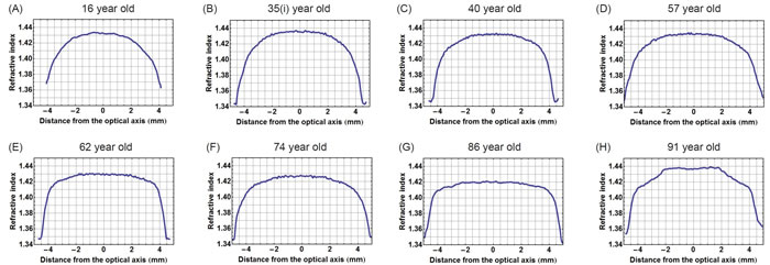 Figure 2 shows the corresponding refractive index plotted along the optic axis in the eight lenses, the contours of which were shown in Figure 1. The central sections that cover two-thirds of the profiles have an almost constant region with small fluctuations and steep gradients on either side. In the 35 year old lens (Figure 2B) the central section is the least flat and in the older lenses, aged 86 and 91 years (Figure 2G and 2H), there are sharp inflections or kinks in the gradient section; these are particularly evident in the oldest lens (Figure 2H).