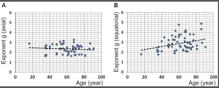 The exponent g for the refractive index profiles along the optic axis and equatorial plane are plotted against age in Figure 5A and 5B respectively for 63 lenses. (For three of the samples the refractive index contours in the sagittal plane exhibited irregular shifts such that accurate power law fits could not be deduced). There is no statistically significant relationship between g along the optic axis and age (p = 0.389). Plotting the exponent from the equatorial profile fits against age (Figure 5B) shows a trend that is statistically significant (p = 0.013). When this data set is divided into younger (below 60 years of age) and older cohorts (60 years of age and older) to distinguish between lenses with and without accommodative capacity, statistical significance is only found for the younger cohort (p = 0.003).