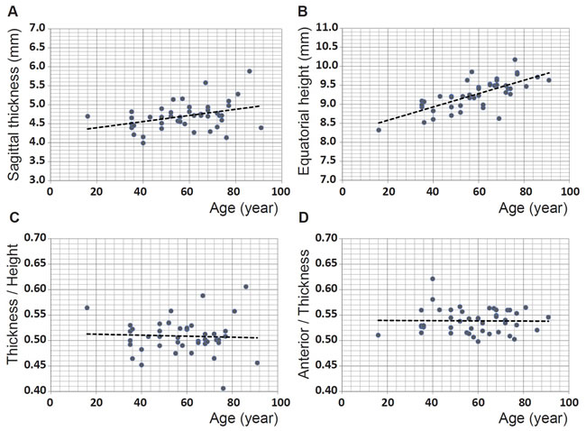 It is worth considering that when the lens is removed from the eye, it is no longer under the tension that is imparted, in vivo, from the ciliary muscle and zonule that hold the lens in place and that mediate the forces that change lens shape. Lenses, pliable enough to accommodate in vivo, will therefore plausibly be expected to take up an accommodated form when removed from the eye and released from tension of the ciliary muscle and zonule. It is not possible to say exactly how accommodated an excised lens will be without seeing how each lens shape changes within the eye across the accommodative range of which that eye is capable. Accommodation is used to greater or lesser extents depending on lifestyle of an individual and how much time is spent on viewing close objects compared to sighting in the distance. It is also influenced by the refractive error and whether or not an individual is short or long-sighted. The latter tend, in younger years if not corrected with spectacles, to require a greater accommodative effort than the short-sighted or those without refractive error in order to compensate for the lack of refractive power of the eye. It is not possible to ascertain lifestyle factors or refractive error from a donor tissue but it may be surmised that lenses, capable of shape change, could be in different states of accommodation when removed from the eye and that these effects may be significant enough to mask trends related to ageing. The findings in this study are consistent with previous studies on in vitro lenses that show individual variations superimposed on ageing trends [30, 35, 39, 40]. Rosen et al [40] from a study of thirty-seven lenses, aged 20-99, found the ratio of equatorial diameter to sagittal thickness to be around 2 to 2.1 which corresponds approximately to the value of around 0.51 for the inverse ratio of thickness to diameter found in this study (Figure 6C). Rosen et al [40] reported that in spite of scatter, the ratio was statistically significant. This is not supported by the findings of this study. Lenses beyond the sixth decade of life, have no accommodative capacity [1]. Therefore on removal from the eye, these lenses, not able to alter their curvature or shape, should be in the same unaccommodated state as they are in the eye and can be compared without the compounding uncertainty of accommodative state. The equatorial height shows statistical significance with age for this older cohort only.