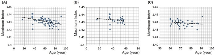 The maximum refractive index from all lenses investigated is plotted against age in Figure 7A. The magnitude of maximum refractive index varies from 1.420 to 1.441 and there appears to be a slight decrease with age that is statistically significant (p << 0.001). A linear equation fitted to the data gives the relationship: maximum refractive index = -0.0001 × age (years) + 1.4385. On closer perusal there are wide individual variations in lenses from the fourth decade (aged 35 and 36 years); there is only a single lens younger than this. The trend to decrease with age appears from Figure 7A to be most evident in lenses aged 60 years and above. When the data are divided into two age cohorts, above and below the age of 60, there is no statistical significance with p = 0.405 and 0.277 for the younger or older cohorts respectively (Figure 7B and 7C).