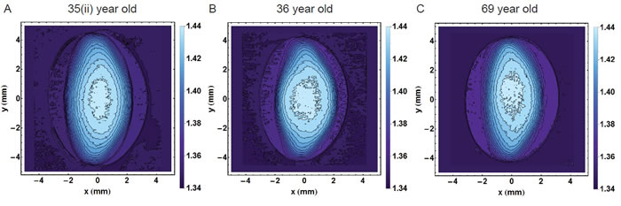 Figure 8: Refractive index contours in the sagittal plane for A. 35 year old lens; B. 36 year old lens; C. 69 year old lens showing the range of individual variations. (The 35 year old lens is labelled 35(ii) to distinguish it from the 35 year old lens in Figure 1).