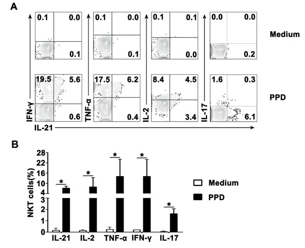 Figure 2: Antigen-induced expression of IL-21 with IFN-γ, TNF-α, IL-2 and IL-17 by CD3+TCRvβ11+ NKT cells PFMCs were incubated for 6 hrs with or without PPD plus anti-CD28. NKT cells were gated and analyzed for the expression of cytokines. A. Statistical results of the expression of IL-21, IFN-γ, TNF-α, IL-2 and IL-17 after stimulation with PPD plus anti-CD28 are shown. *, P < 0.05. B. The expression of IL-21 with IFN-γ, TNF-α, IL-2 and IL-17 are shown. Data are representative of three independent experiments.