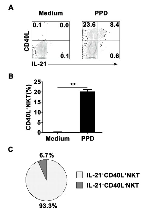 Figure 5: The expression of CD40L on IL-21- expressing NKT cells PFMCs were stimulated for 6 hrs with or without PPD plus anti-CD28. The cells were stained, gated on NKT cells and analyzed for the expression of CD40L on IL-21+ NKT cells. A. The expression of CD40L and production of IL-21 were detected by FACS. Data are representative of three independent experiments. B. Statistical results of the expression of CD40L on NKT cells. **, P < 0.01. C. Results of the expression of CD40L on IL-21+ and IL-21- NKT cells.