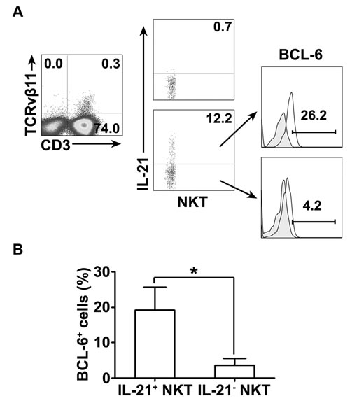 To detect whether IL-21-expressing NKT cells express BCL-6, freshly isolated PFMCs were cultured with PPD plus anti-CD28. CD3+TCRvβ11+ NKT cells were gated for expression of IL-21. IL-21- expressing NKT cells and non-IL-21- expressing NKT cells were gated for the analysis of expression of BCL-6. The results in Figure 6A showed that after stimulation with PPD plus anti-CD28, CD3+TCRvβ11+ NKT cells expressed IL-21, and IL-21-expressing NKT cells and non-IL-21- expressing NKT cells coexpressed certain levels of BCL-6. Statistical results in Figure 6B demonstrated that after stimulation nearly 20% of CD3+TCRvβ11+ NKT cells expressing IL-21 also expressed BCL-6, which was significantly greater than the frequency of BCL-6-expressing cells among non-IL-21- expressing NKT cells.
