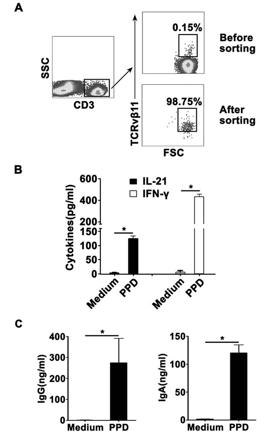 To further define the functions of CD3+TCRvβ11+ NKT cells, we isolated PFMCs and sorted purified CD3+TCRvβ11+ NKT cells by FACs. The results in Figure 7A showed that before the sorting, the frequency of CD3+TCRvβ11+ NKT cells was about 0.15%; but after the sorting, the purity of CD3+TCRvβ11+ NKT cells was nearly 99%. We co-cultured sorted CD3+TCRvβ11+ NKT cells and monocytes for 3 days with PPD plus anti-CD28 and then collected the supernatants to detect the production of IFN-γ and IL-21. Results in Figure 7B showed that without stimulation, CD3+TCRvβ11+ NKT cells did not secrete cytokines, and following stimulation with PPD plus anti-CD28, CD3+TCRvβ11+ NKT cells produced both IFN-γ and IL-21. Furthermore, we cultured sorted CD3+TCRvβ11+ NKT cells together with purified B cells to observe functions of CD3+TCRvβ11+ NKT cells. As shown in Figure 7C, purified B cells could secrete large amounts of IgG and IgA when cultured with CD3+TCRvβ11+ NKT cells. Based on the results, we speculate that at the local site of M. tuberculosis infection, CD3+TCRvβ11+ NKT cells secrete Th1 cytokines (IFN-γ, TNF-α and IL-2), Th17 cytokines (IL-17), and IL-21 and help B cells express Igs in order to protect against M. tuberculosis infection.